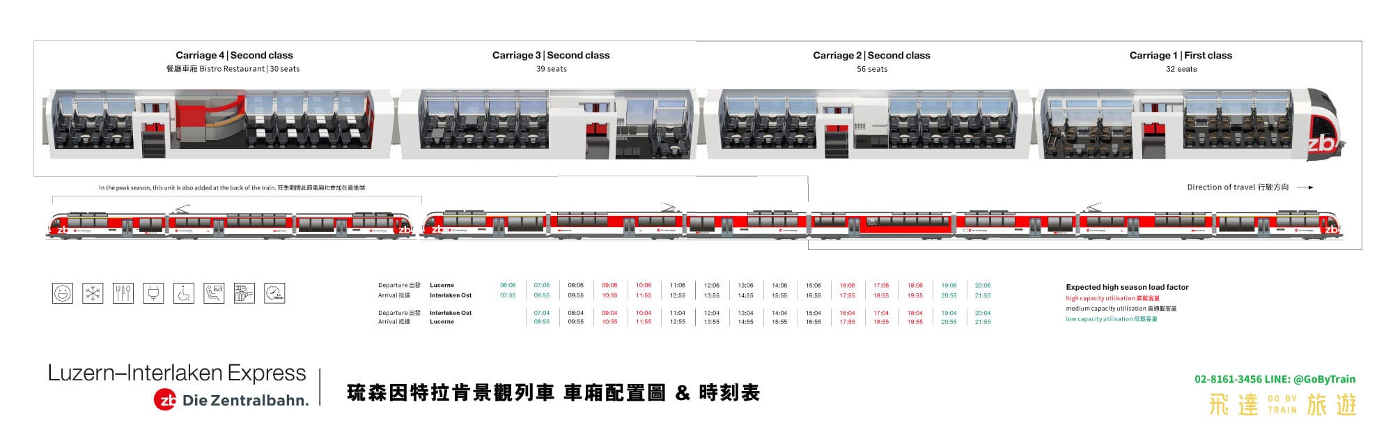 Luzern–Interlaken Express is a famous scenic train in Switzerland, connecting Luzern and Interlaken Ost. The entire journey takes about 1 hour and 50 minutes, passing through magnificent lakes and Alpine scenery. It is part of the eastern section of the GoldenPass Line.