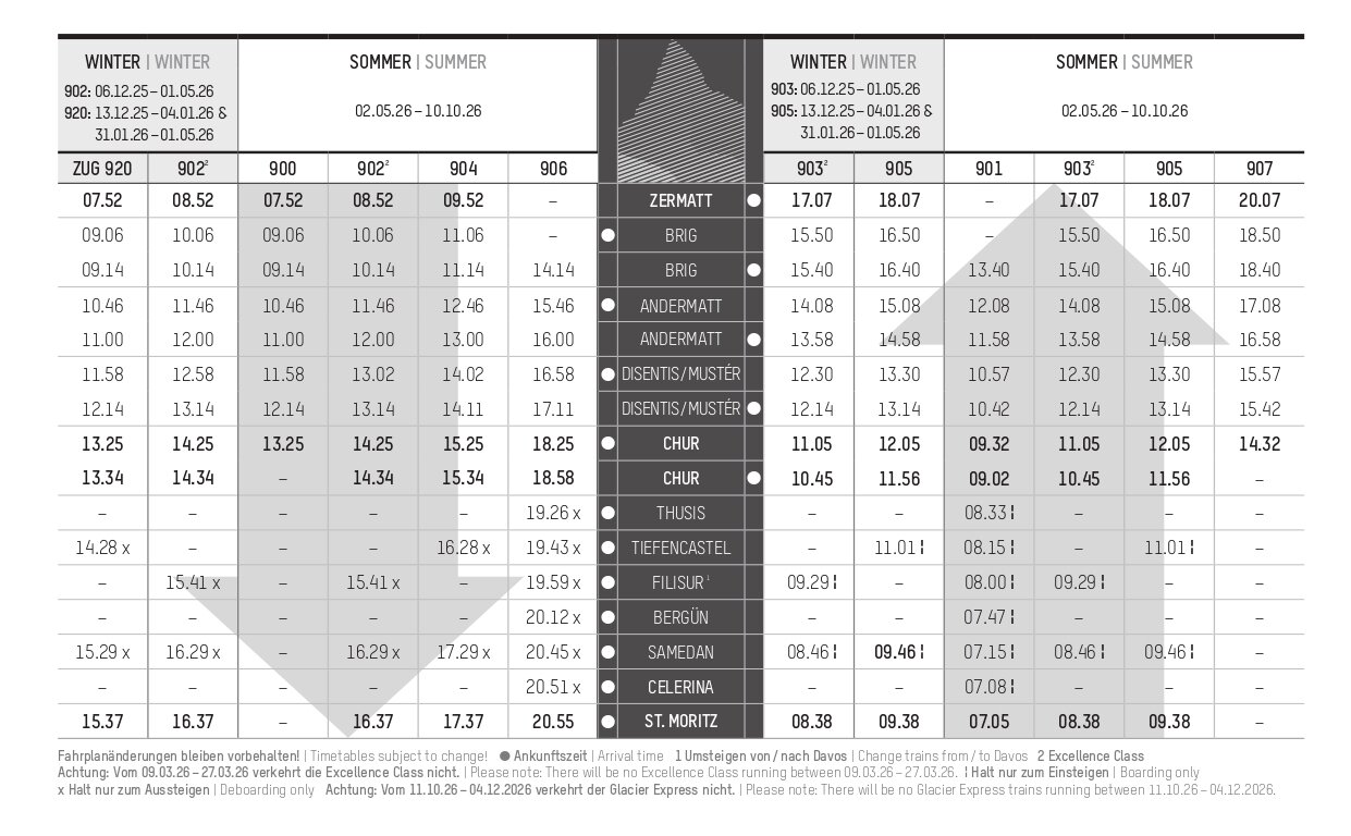 The Glacier Express will not operate from October 12 to December 5, 2025 & October 11 to December 4, 2026.