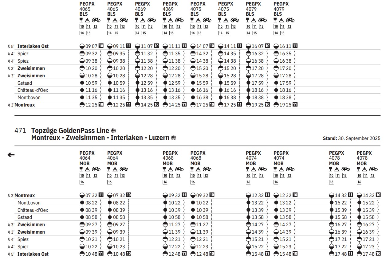 The railway tracks are finally built differently: metric (1 m) between Montreux and Zweisimmen and normal gauge (1,435 m) between Zweisimmen and Interlaken.