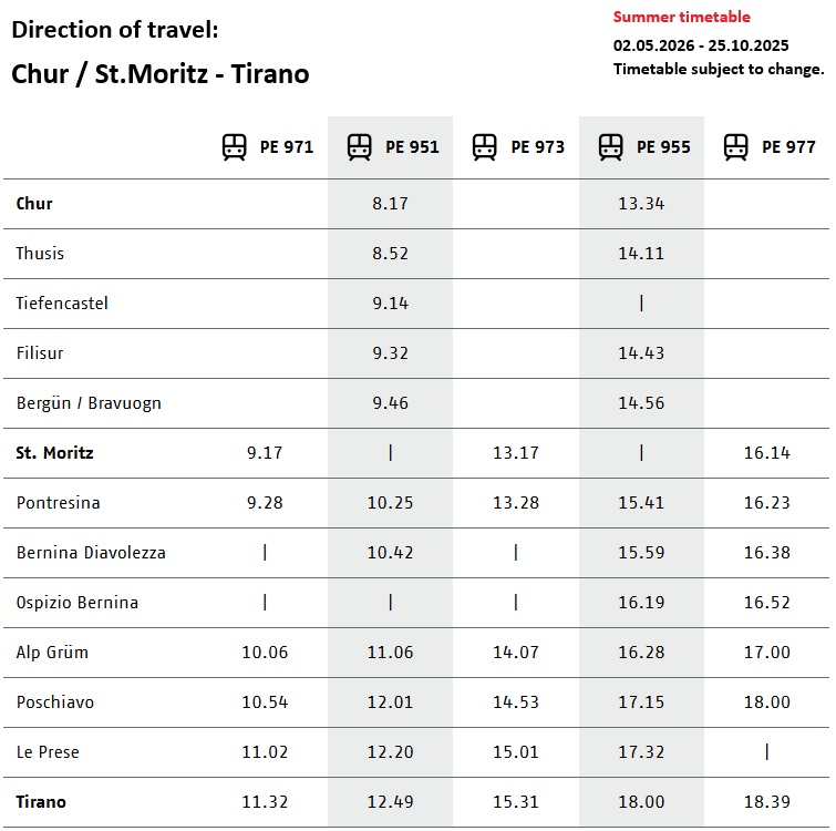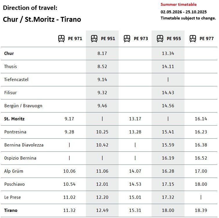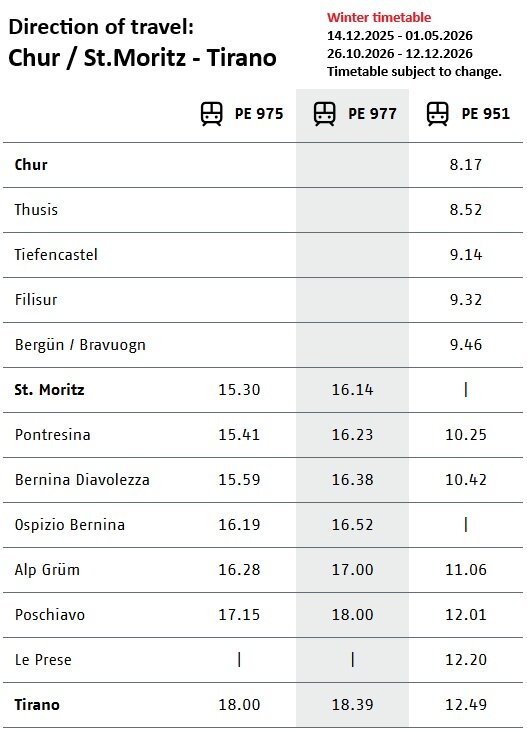 § St Moritz 聖莫里茲 - Tirano 蒂拉諾不分淡旺季,全年 2025/12/14 - 2026/12/12 票價皆相同。
