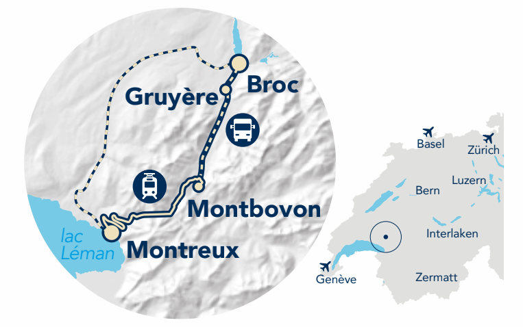 Enjoy stunning views of the sunny vineyards surrounding Montreux and the picturesque pastures near the medieval town of Gruyères.