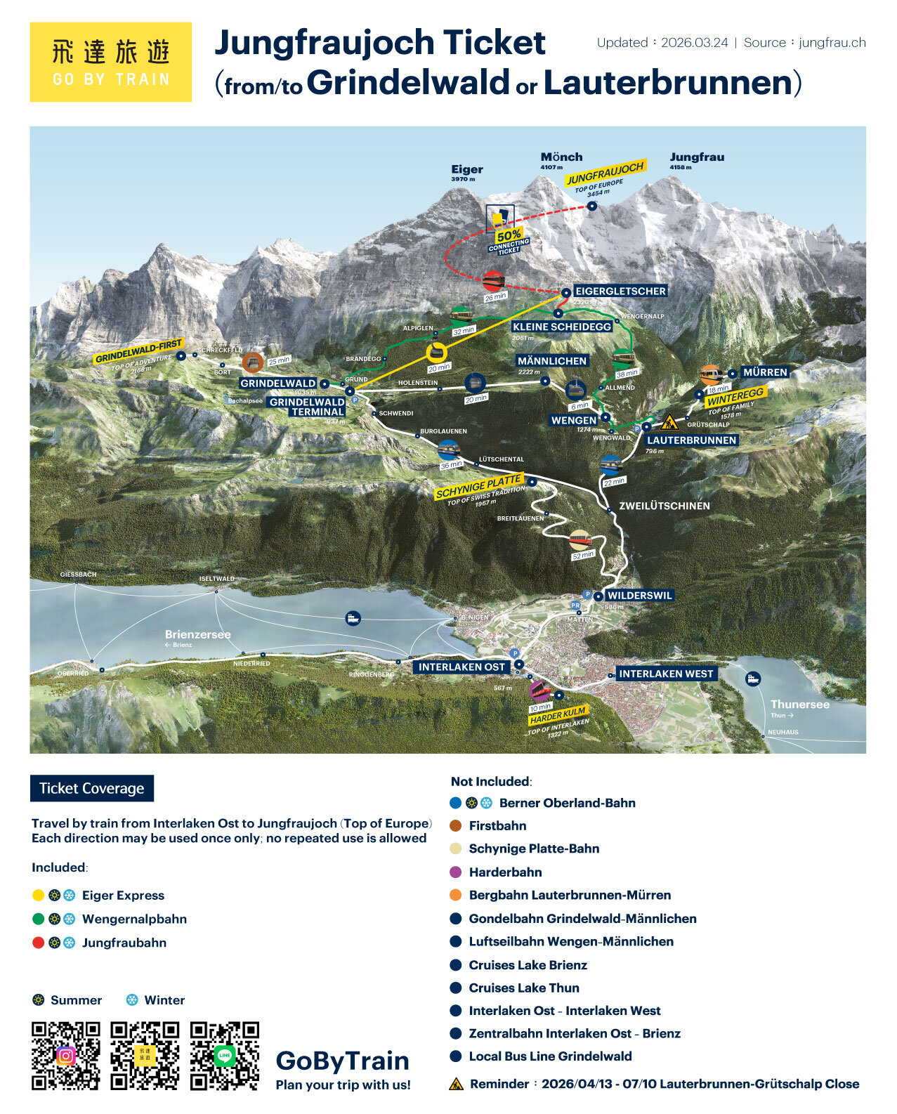 § 持有 Eurail / STP / 半價卡的旅客,Lauterbrunnen - Wengen 路段已包含在該通行證。
