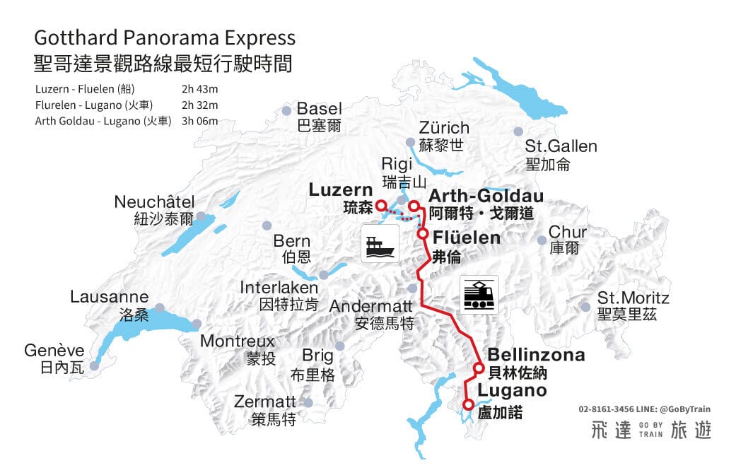 § 火車路線為:Arth Goldau -(火車)- Fluelen -(火車)- Lugano。