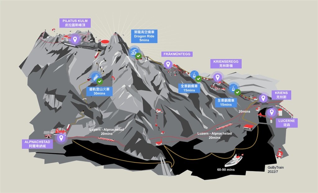 可搭乘全世界角度最陡斜的單軌火車登頂、眺望琉森市的美景。交通方式:使用瑞士旅遊通行證搭乘遊覽船至皮拉圖斯山下,再轉乘登山鐵路上山,回程可搭乘空中纜車下山。須另購買皮拉圖斯山交通票。Toboggan Ride 滑道 – 瑞士最長的滑道 Rodelbahn Fräkigaudi 就在 Fräkmüntegg 山脊、四月中至十月底限定、每趟約 9 瑞朗。