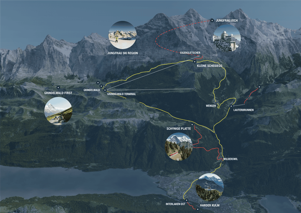 兩小時的旅程中,遊客將欣賞到水晶般的湖泊、浪漫的瀑布,翻越壯觀的 Brünig 山口。透過全景車窗,一路上可以欣賞瑞士阿爾卑斯山部分最壯麗的景色。