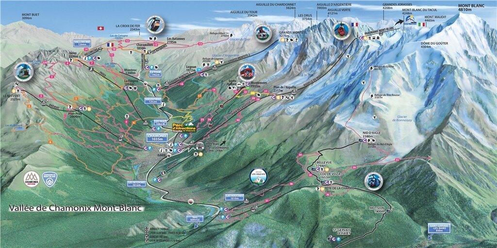 白朗峰 Mont Blanc 位於法瑞邊境,阿爾卑斯山的最高峰,標高 4807 公尺,向來有「歐洲聖母峰」之稱,山上的萬年雪四季不融,因此峰頂終年白雪皚皚,是世界排名第三最多遊客的自然風景區!白朗峰冰海山谷的景色屬世界級的景觀,冬天是滑雪聖地,夏天則是戶外活動的好地方。這裡您可以挑戰許多極限運動,如高崖跳傘、登山、還有登山車 Mountain Bike!