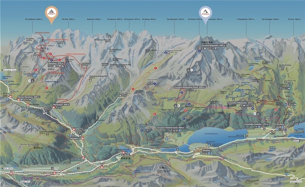 柯爾瓦奇峰 Corvatsch 從鄰近的 Silvaplana / Suriej 搭乘纜車上去,除了可以眺望下面 2 個湖泊,還可體驗千年冰窟。科爾瓦奇峰 Piz Corvatsch 位在海拔 3303 公尺。 在 Corvatsch 上,您可以欣賞到 Piz Bernina 的 Biancograt 山脊的高山景色。 峰頂還有知名的 ORMA Whisky-Destillerie 威士忌酒吧。另外,從中點站 Murtel 則有知名的全景觀健行路線可以走到 Furtschellas,而 Furtschellas 則提供了一個擁有六個高山湖泊的遠足天堂。