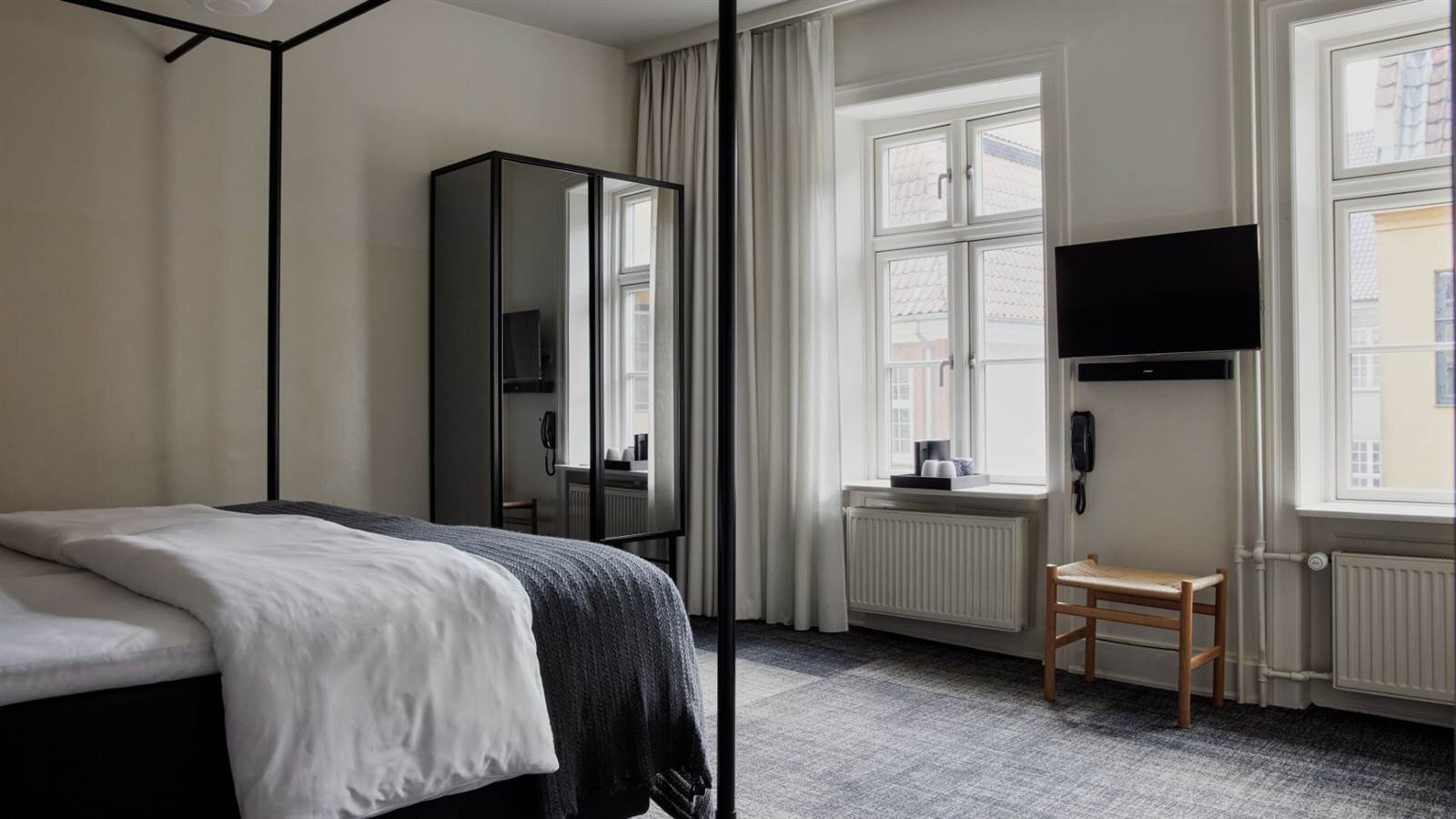 歷史建築翻新,由 Brøchner Hotels 集團主導,以深色木材、溫潤石材搭配丹麥設計燈具(如 Louis Poulsen)。屋頂酒吧能遠眺市政廳,空間融合懷舊與現代。