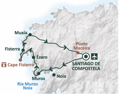 這趟旅行將會有專人帶著你,從 Santiago 坐小巴士前往 Fisterra 小鎮。你將會看到加利西亞北岸崎嶇且變化多端的海岸線、美景如畫的小漁村 Muros、有著瀑布美景的 Ezaro 和 Pindo 山、Muxia 聖殿 Sanctuary of Muxia,還有美味的當地料理待你品嘗。