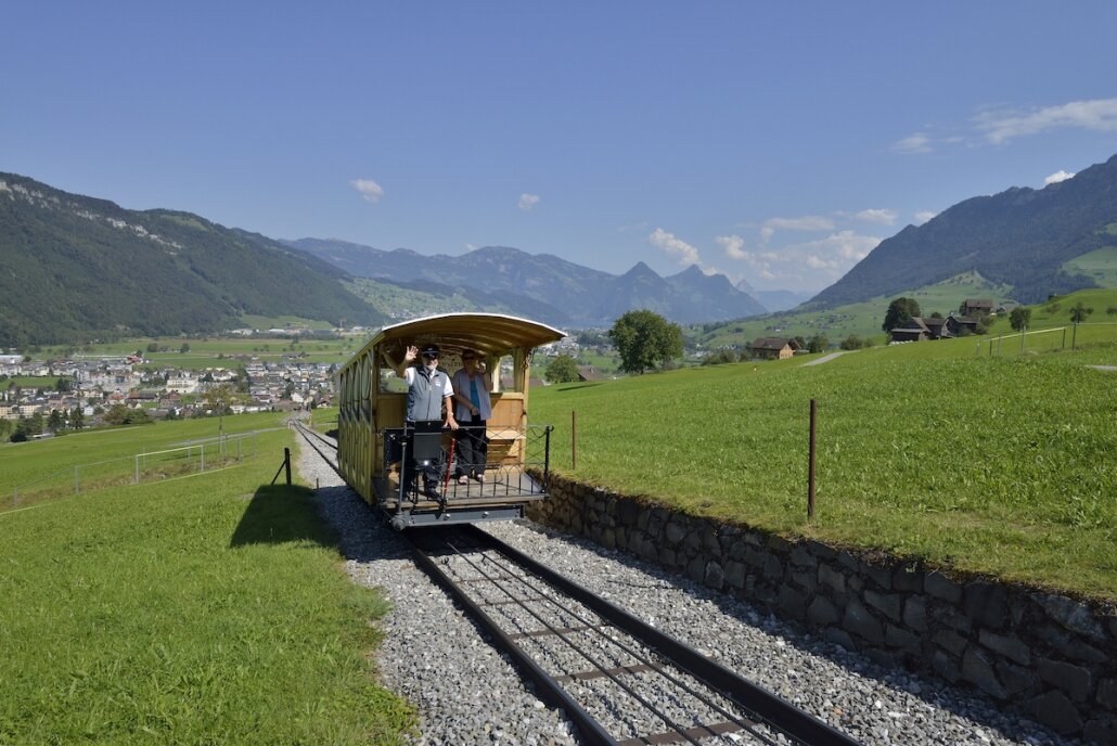 2022 使用瑞士旅行通行證可免費搭乘此纜車。Stoos 施圖斯位在 Fronalpstock 弗朗阿爾卑斯托山腰上的無車小鎮,從 Schwyz 施維茲 搭上 Stoos 的這段纜車花費 14 年、克服世界最大斜度的高山纜車。四座圓柱狀車廂配上黃色框邊外表顯得更加引人矚目。想上山頂可以從 Stoos 搭纜車上 Fronalpstock 或 Klingenstock 克林根斯托山,喜歡健行的朋友更可以挑戰從 Klingenstock 到 Fronalpstock 全景徒步!