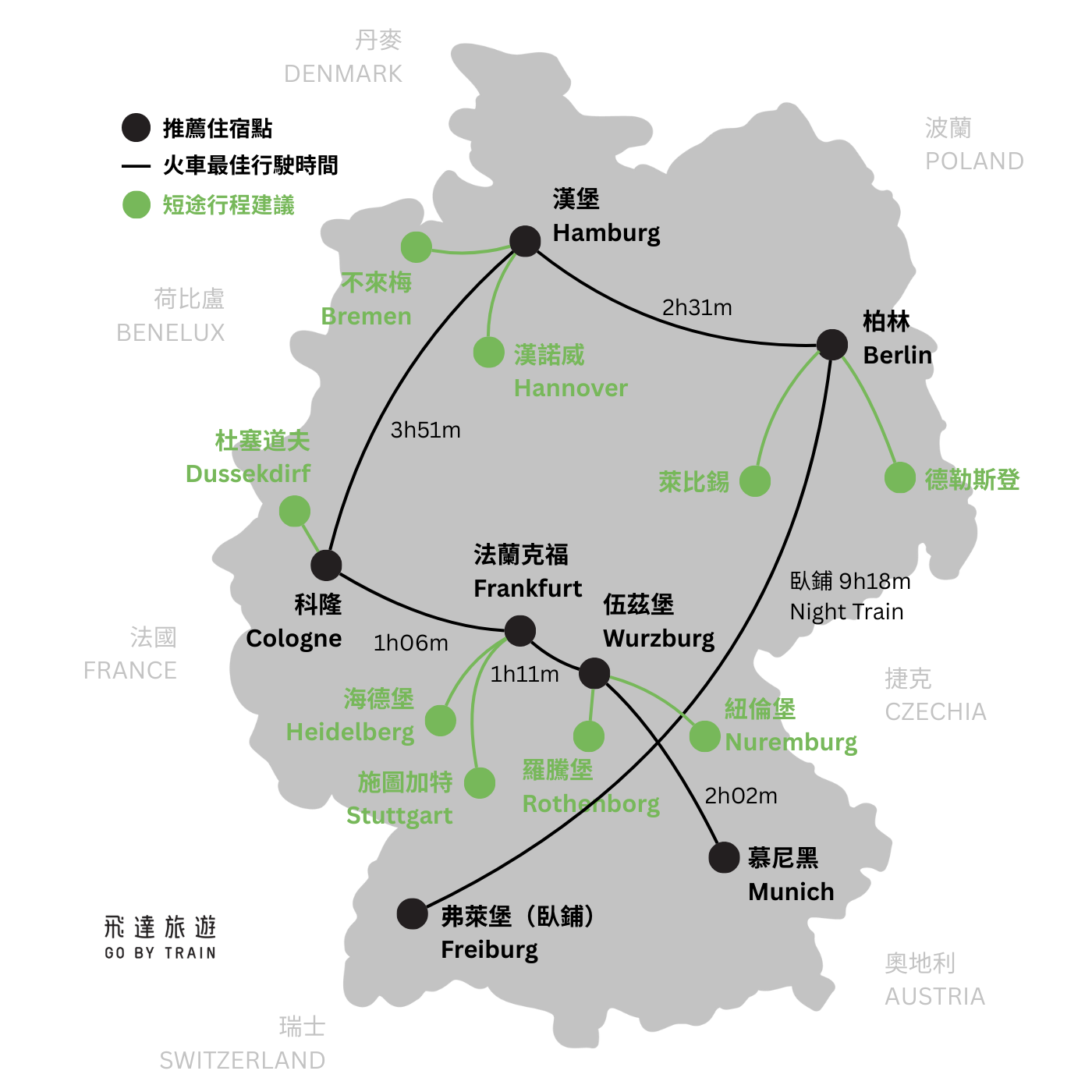 用火車深度走遍德國南北:慕尼黑、法蘭克福、科隆、漢堡、柏林一次串聯。行程可拆段預訂、自由加夜,適合德國自由行、出差、陪出差與探親旅客,不怕德鐵誤點的彈性設計。