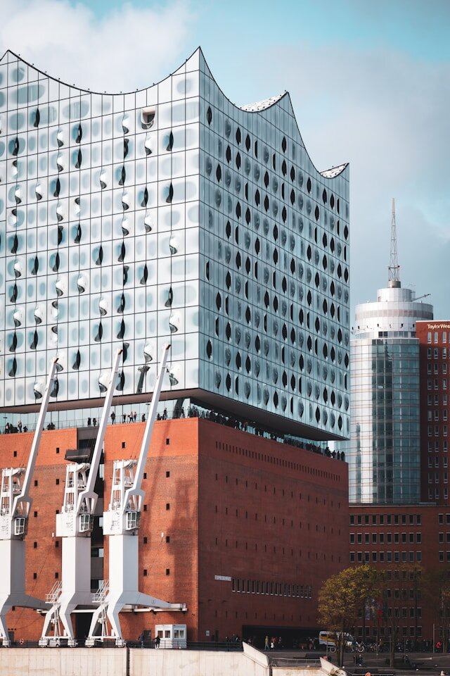 這座坐落於港口邊的波浪狀玻璃建築,與古老的紅磚基座形成鮮明對比,象徵著城市的現代創新。其玻璃帷幕反射著雲影與河面,是當代的建築傑作。