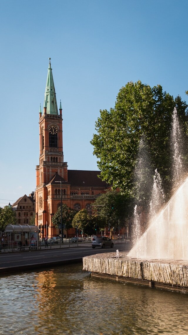 紅磚教堂展現了城市深厚的歷史底蘊與德式建築美學,與前景的噴泉交織出靜謐的都市景觀。