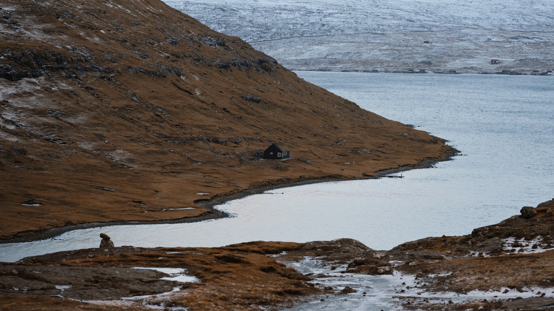 今天,我們將造訪法羅群島最具代表性的三個古老村落。清晨出發,第一站來到寧靜的 撒斯港灣(Saksun)。村落前方的潟湖被峽灣與群山環抱,草頂小屋點綴其中,宛如一幅靜謐的畫作。