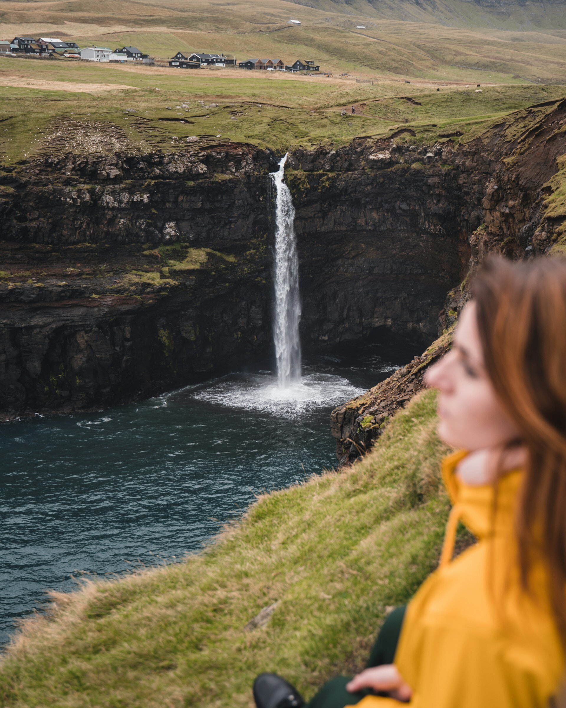 法羅群島最具代表性的名信片風景。瀑布從翠綠的懸崖直墜入北大西洋,背景是隱世的 Gásadalur 村落。