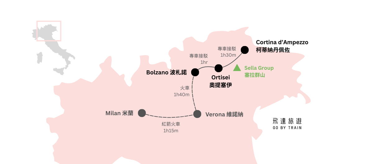 從米蘭進出,串聯 Ortisei 與 Cortina 兩大核心據點,Sellaronda、Seceda、Sassolungo、Marmolada 與三姐妹山,都在這張地圖裡。