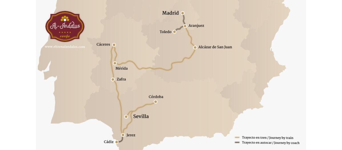 搭上 Al Ándalus 豪華列車,展開一趟從馬德里 Madrid 到塞維亞 Sevilla 的尊爵鐵道之旅。 走訪托雷多 Toledo、卡塞雷斯 Cáceres、赫雷斯 Jerez、哥多華 Córdoba 等世界遺產城市,體驗皇室宮殿、羅馬遺跡、雪莉酒莊與安達盧西亞舞馬秀。 列車車廂典雅復古,配備套房臥鋪、餐廳與沙龍酒吧。無須換飯店、不必拖行李,每天都在舒適的臥鋪中醒來,享受美食與導覽,深入西班牙的歷史與風情。 這是一趟集藝術、文化與品味於一身的旅程,適合追求獨特體驗的您。