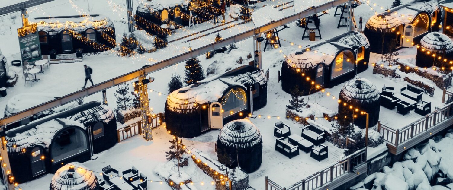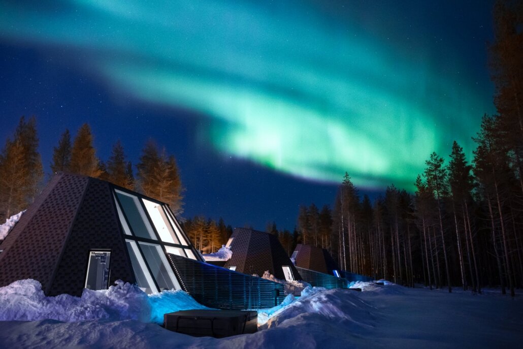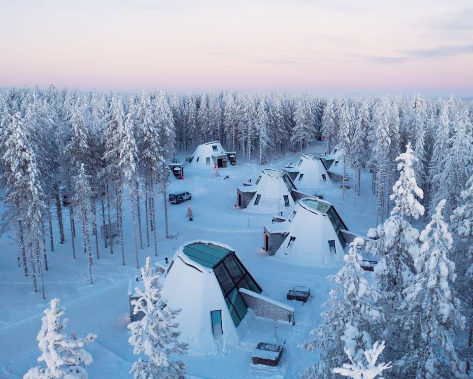 獨特的北極風情住宿體驗,每間套房皆以木屋設計,懸掛於山坡上,擁有大面積全景窗戶,俯瞰雪景與極光,宛如置身童話世界。設有高端餐廳 Rakas,提供當地食材製作的精緻佳餚。選擇此旅館需加價。