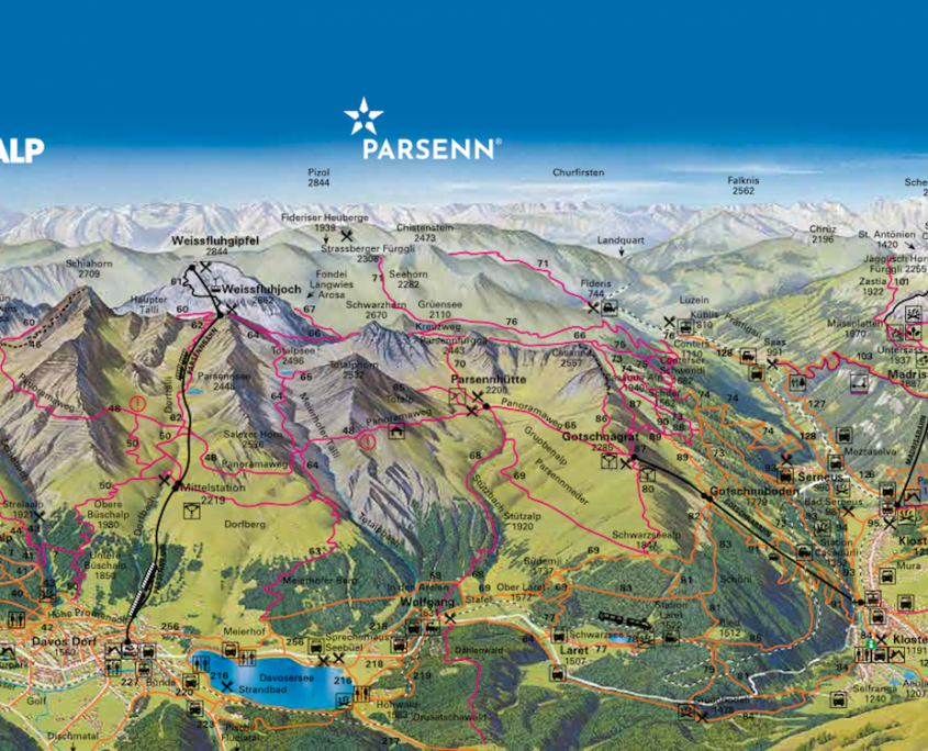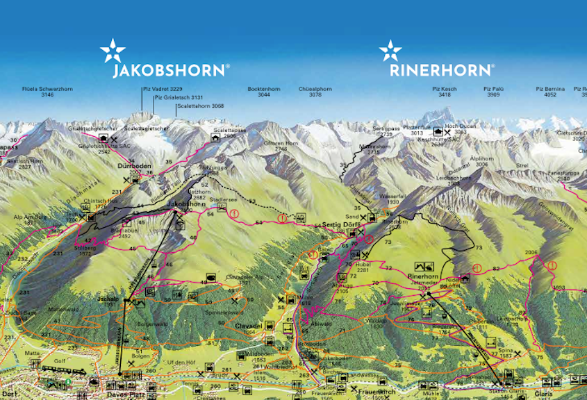 從達沃斯 Davos 可以登上 Jakobshorn, Parsenn, Gotschna, Rinerhorn, Madrisa 五座主要山峰 Davos Klosters Mountains 又被稱為 DKM。