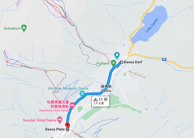 抵達 Davos Platz 車站後將行李放下,你可以選擇租台腳踏車前往 Lake Davos 達沃斯湖畔。有沙灘、SUP、獨木舟、沿湖步道可以遊覽。Davos Platz – Davos Dorf :騎單車單程約 11 分鐘 2.9km(如下圖)、搭火車一站約 3 分鐘、搭公車約 10 分鐘。