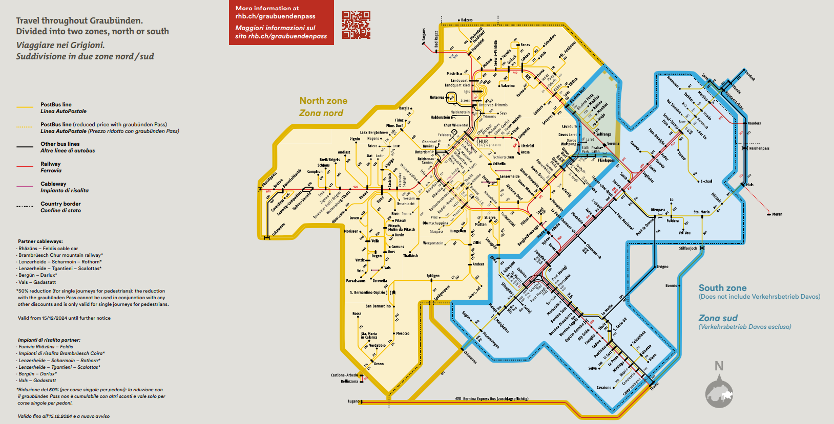 可在所購火車票效期內,無限次搭乘格勞賓登州境內的雷蒂亞鐵路線 RhB、瑞士國鐵 SBB(Chur - Bad Ragaz)、馬特洪峰哥達鐵路 MGB(Disentis/Mustér - Oberalp Pass)、瑞士郵政巴士 Post Bus、義大利部份巴士(Livigno & Bormio)少部分纜車(Feldis & Gadastatt),但票價不含景觀列車訂位、餐飲之費用。