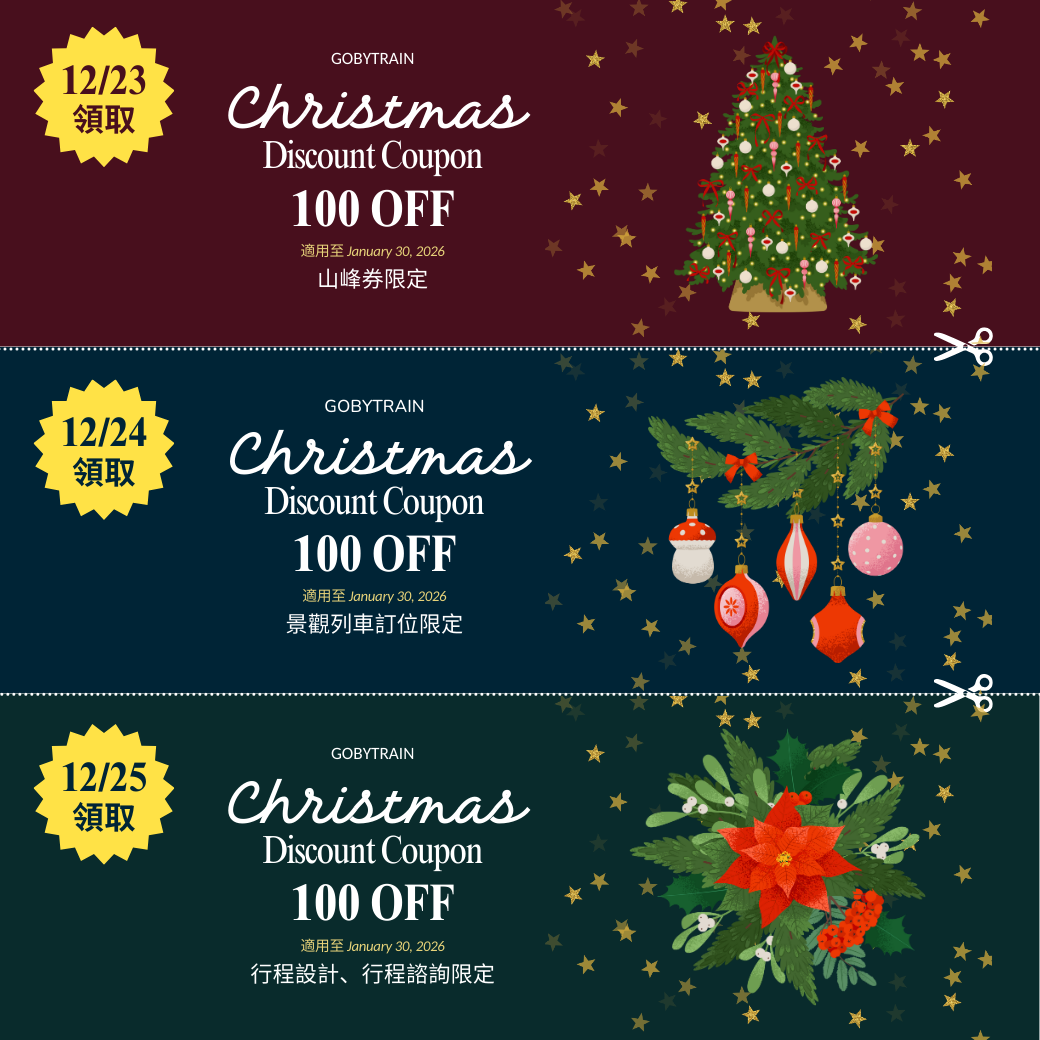 - 12/24 - 景觀列車訂位、網卡、交通卡 100TWD off 折扣代碼 XMASEVE